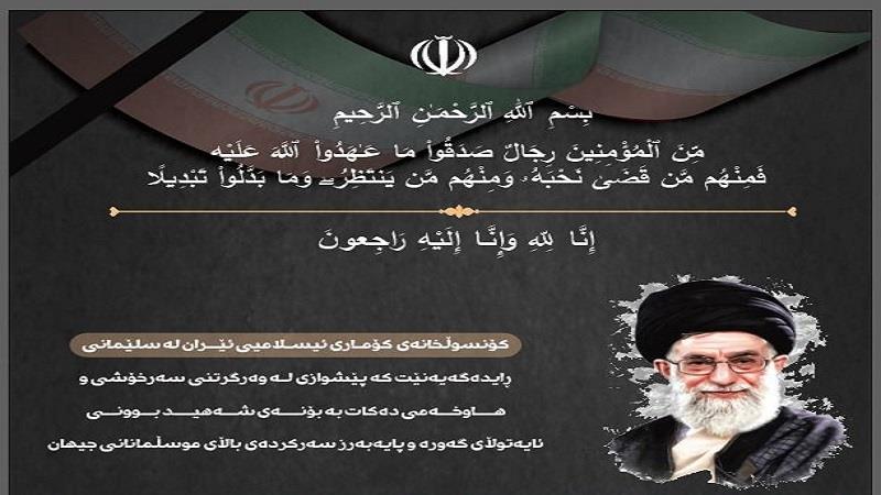 كونسوڵخانهی گشتی كۆماری ئیسلامی ئێران له سلێمانی رایگهیاند كه له پارێزگای سلێمانی پرسه بۆ ئایهتوڵا عهلی خامنهیی، رێبهری باڵای شۆڕشی ئیسلامیی ئێران دادهێت.