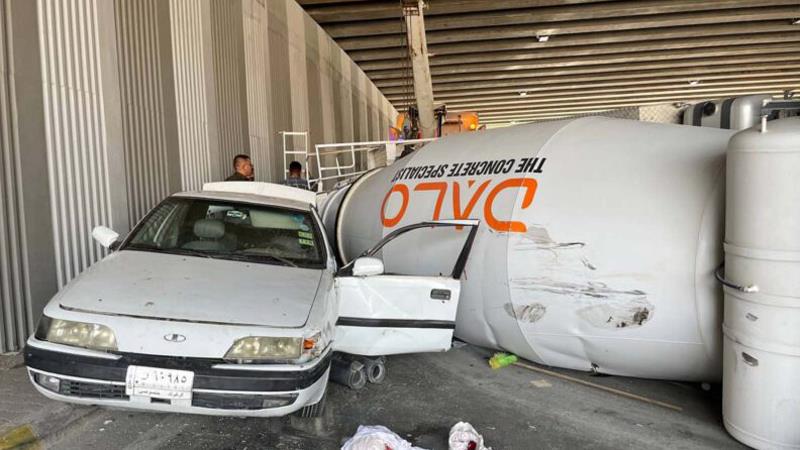 نیوەڕۆی ئەمڕۆ لەژێر پردی باخی بەختیاری لە شاری سلێمانی، میکسەرێکی گواستنەوەی چیمەنتۆ وەرگەڕا و کەوت بەسەر ئۆتۆمبێلێکی دیکەدا.